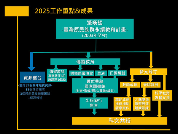一、每年持續扶持約158位傳習老師,39個原住民的傳習團隊,為部落營造永續發展的藝文生態環境,並承擔部落與族群文化復振、...