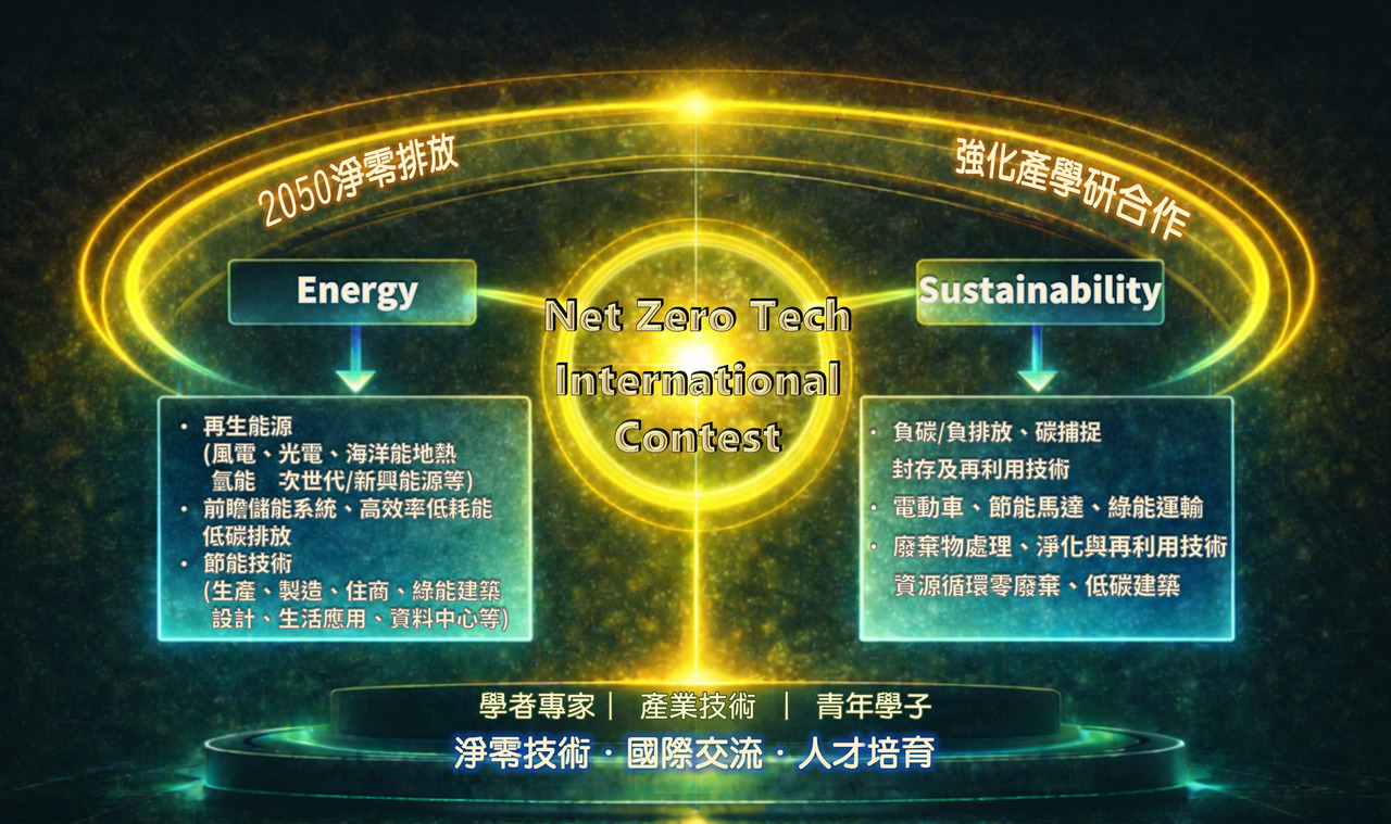 競賽主題 Net Zero Tech,技術領域包括再生能源 (風電、光電、海洋能、地熱、氫能、前瞻能源…);前瞻儲能系統、高效率低耗能、低碳排放;負碳、碳捕捉、封存及再利用技術;電動車、節能馬達、綠能運輸;廢棄物處理與淨化技術、資源循環零廢...