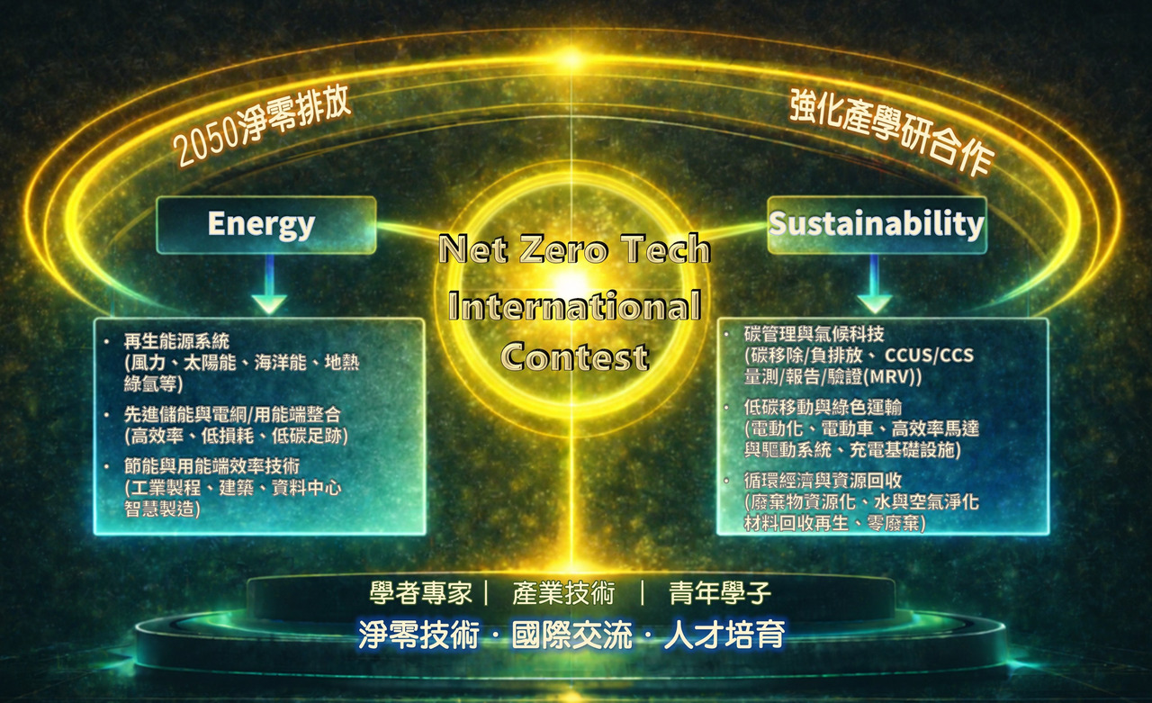競賽主題 Net Zero Tech,技術領域包括再生能源系統(風力、太陽能、海洋能、地熱、綠氫等);先進儲能與電網用能端整合(高效率、低損耗、低碳足跡);節能與用能端效率技術(工業製程、建築、資料中心、智慧製造);碳管理與氣候科技(碳移除...